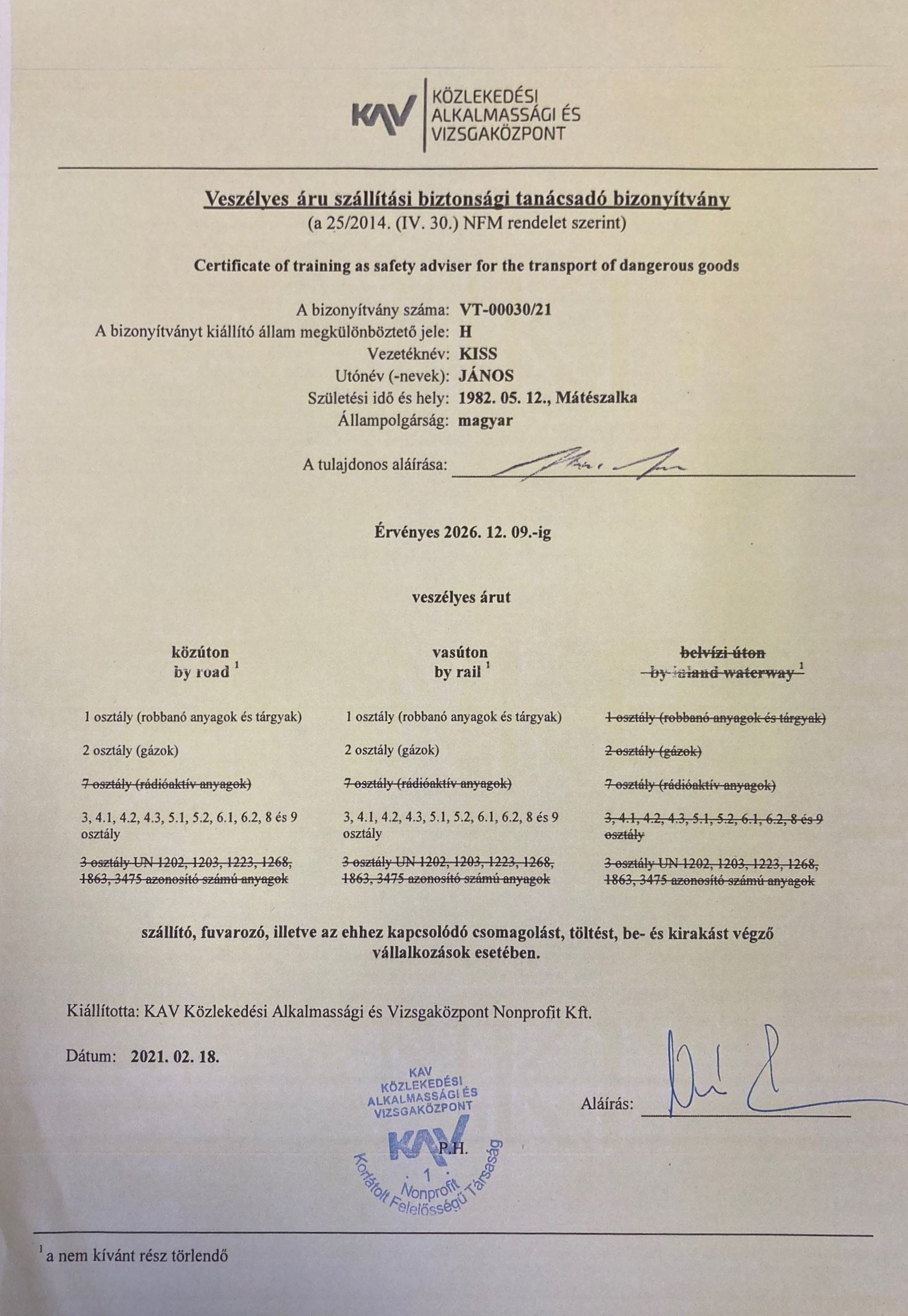 Veszélyes áru szállítási biztonsági tanácsadó bizonyítvány